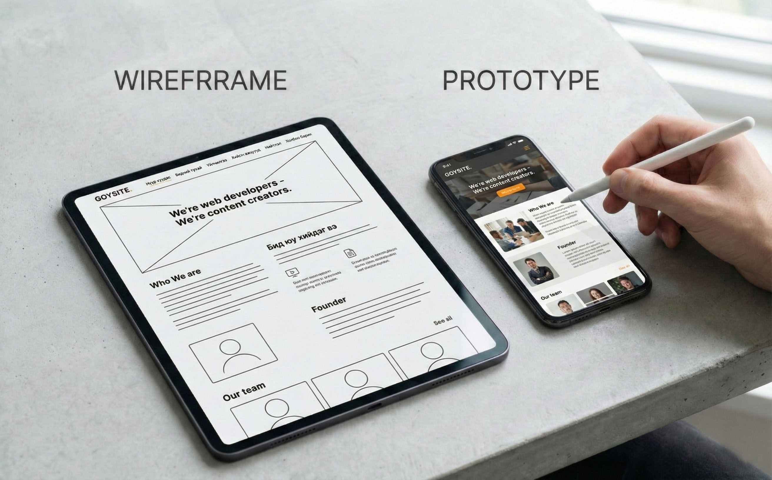 - Wireframe: A low-fidelity blueprint used in the early stages to define the layout of elements.